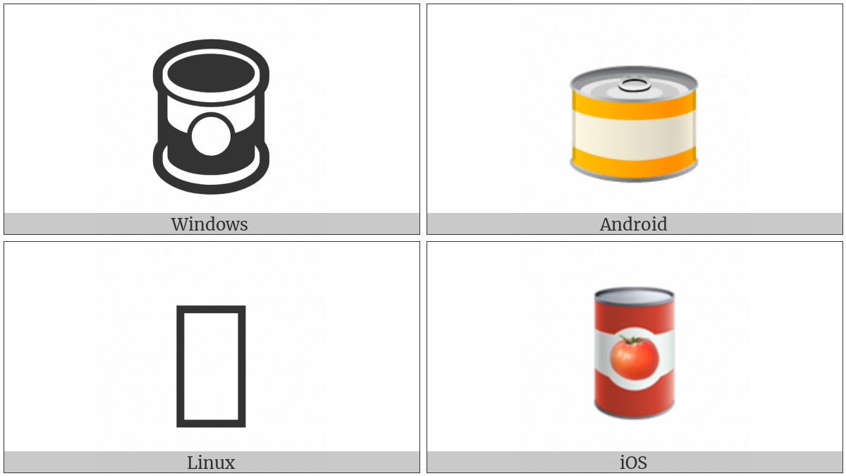 The image below shows how the “Canned Food” symbol might look like on different operating systems. If the font in which this web site is displayed does not contain the symbol and there is no fallback font able to render it, you can use the image below to get an idea of what it should look like.