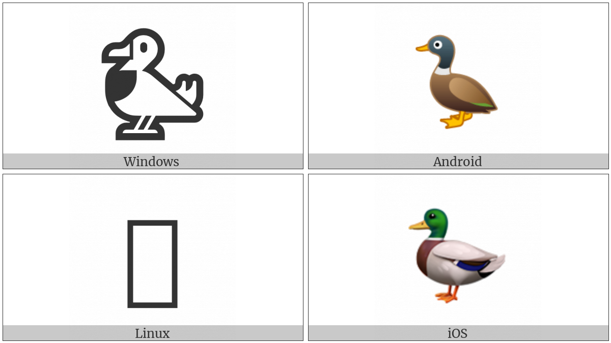 The image below shows how the “Duck” symbol might look like on different operating systems. If the font in which this web site is displayed does not contain the symbol and there is no fallback font able to render it, you can use the image below to get an idea of what it should look like.