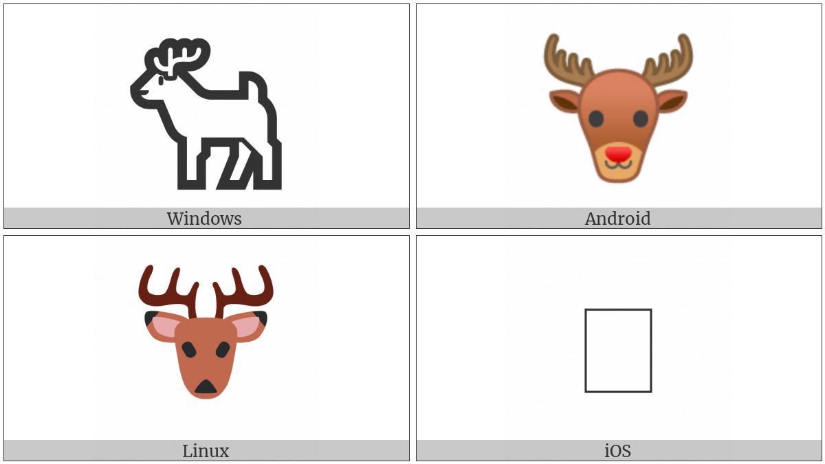 The image below shows how the “Deer” symbol might look like on different operating systems. If the font in which this web site is displayed does not contain the symbol and there is no fallback font able to render it, you can use the image below to get an idea of what it should look like.