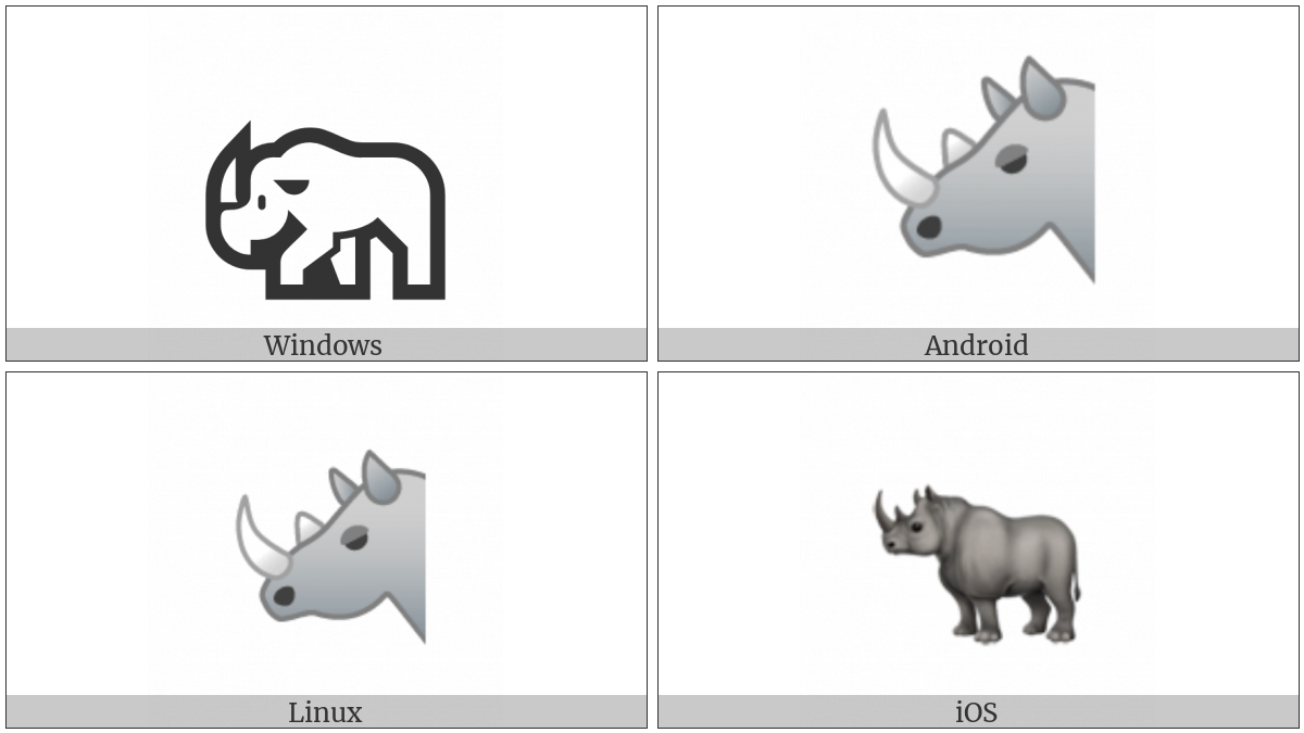 The image below shows how the “Rhinoceros” symbol might look like on different operating systems. If the font in which this web site is displayed does not contain the symbol and there is no fallback font able to render it, you can use the image below to get an idea of what it should look like.