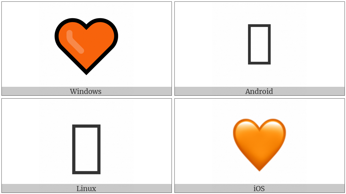 The image below shows how the “Orange Heart” symbol might look like on different operating systems. If the font in which this web site is displayed does not contain the symbol and there is no fallback font able to render it, you can use the image below to get an idea of what it should look like.