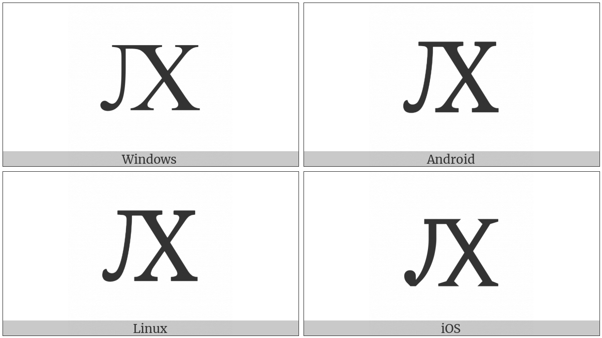 The image below shows how the “Cyrillic Capital Letter Lha” symbol might look like on different operating systems. If the font in which this web site is displayed does not contain the symbol and there is no fallback font able to render it, you can use the image below to get an idea of what it should look like.