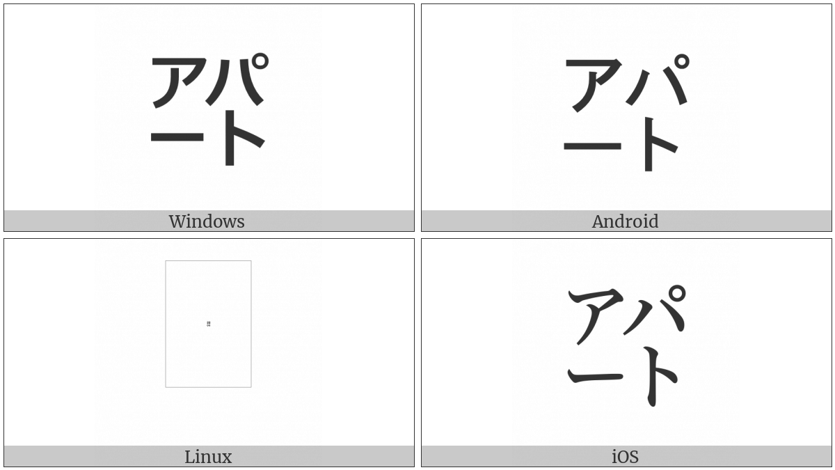 The image below shows how the “Square Apaato” symbol might look like on different operating systems. If the font in which this web site is displayed does not contain the symbol and there is no fallback font able to render it, you can use the image below to get an idea of what it should look like.