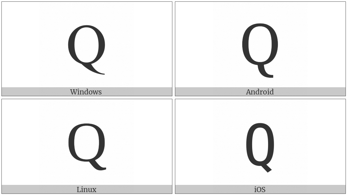 The image below shows how the “Cyrillic Capital Letter Qa” symbol might look like on different operating systems. If the font in which this web site is displayed does not contain the symbol and there is no fallback font able to render it, you can use the image below to get an idea of what it should look like.