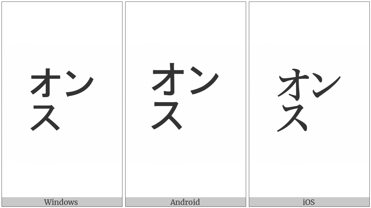 The image below shows how the “Square Onsu” symbol might look like on different operating systems. If the font in which this web site is displayed does not contain the symbol and there is no fallback font able to render it, you can use the image below to get an idea of what it should look like.