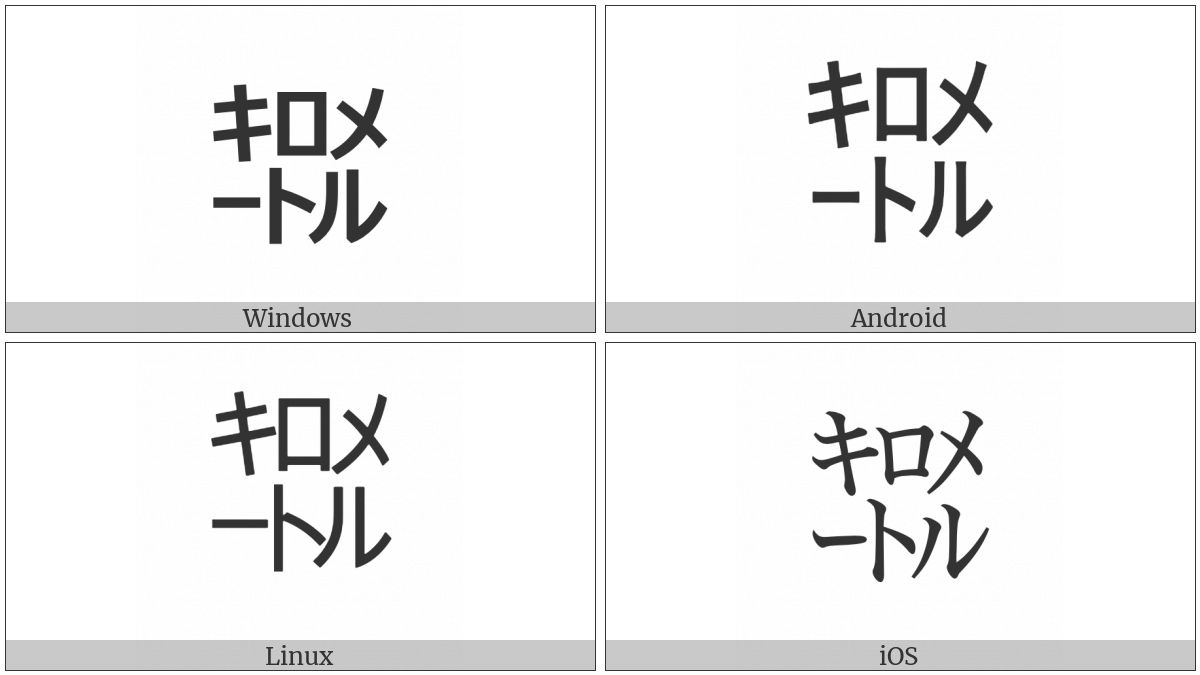 The image below shows how the “Square Kiromeetoru” symbol might look like on different operating systems. If the font in which this web site is displayed does not contain the symbol and there is no fallback font able to render it, you can use the image below to get an idea of what it should look like.