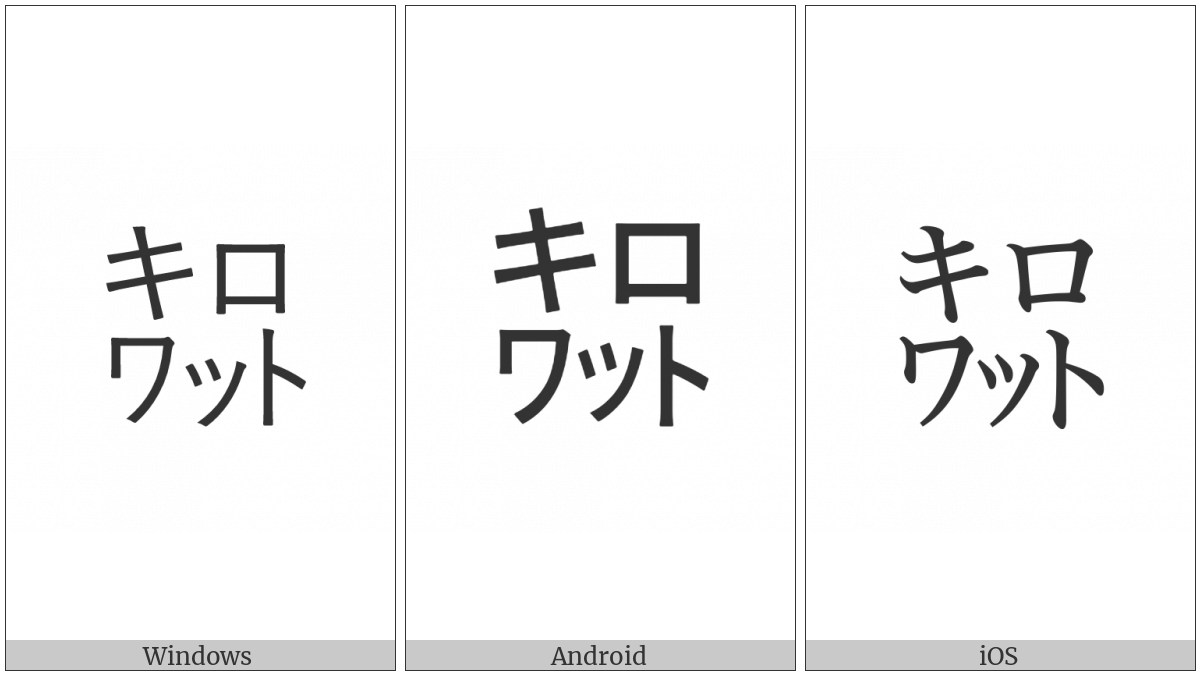 The image below shows how the “Square Kirowatto” symbol might look like on different operating systems. If the font in which this web site is displayed does not contain the symbol and there is no fallback font able to render it, you can use the image below to get an idea of what it should look like.