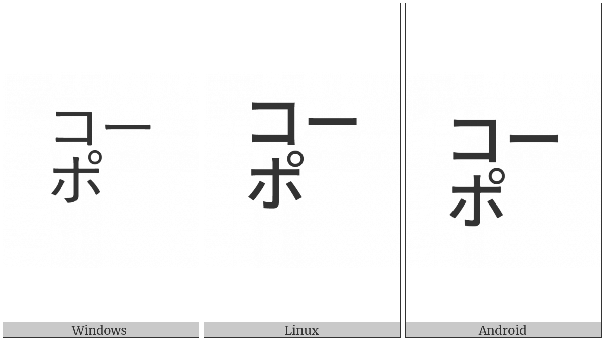 The image below shows how the “Square Koopo” symbol might look like on different operating systems. If the font in which this web site is displayed does not contain the symbol and there is no fallback font able to render it, you can use the image below to get an idea of what it should look like.
