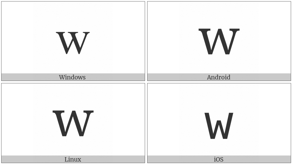 The image below shows how the “Cyrillic Small Letter We” symbol might look like on different operating systems. If the font in which this web site is displayed does not contain the symbol and there is no fallback font able to render it, you can use the image below to get an idea of what it should look like.