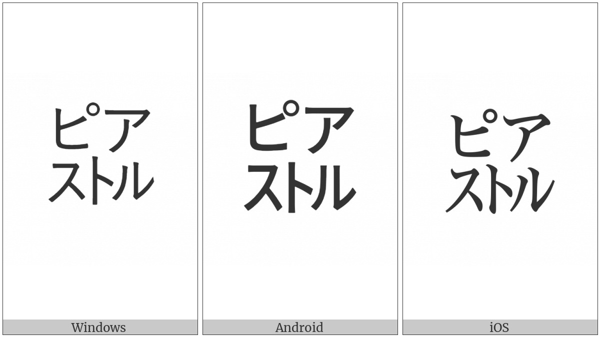 The image below shows how the “Square Piasutoru” symbol might look like on different operating systems. If the font in which this web site is displayed does not contain the symbol and there is no fallback font able to render it, you can use the image below to get an idea of what it should look like.