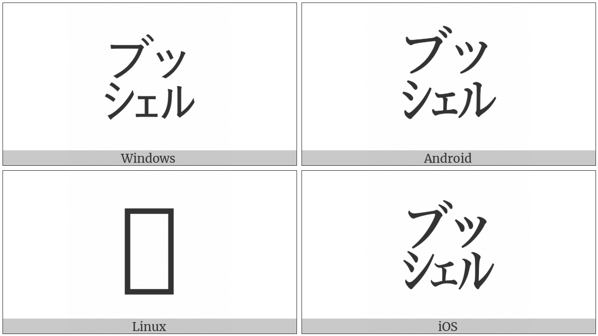 The image below shows how the “Square Bussyeru” symbol might look like on different operating systems. If the font in which this web site is displayed does not contain the symbol and there is no fallback font able to render it, you can use the image below to get an idea of what it should look like.