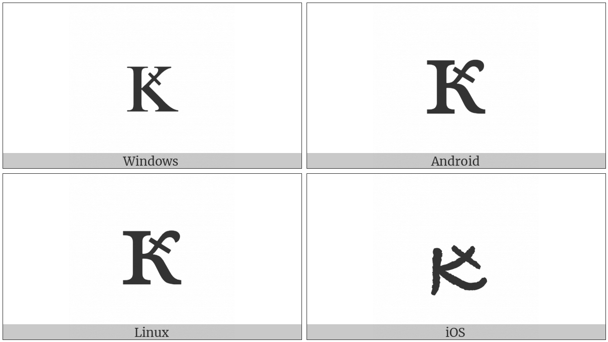 The image below shows how the “Cyrillic Small Letter Aleut Ka” symbol might look like on different operating systems. If the font in which this web site is displayed does not contain the symbol and there is no fallback font able to render it, you can use the image below to get an idea of what it should look like.