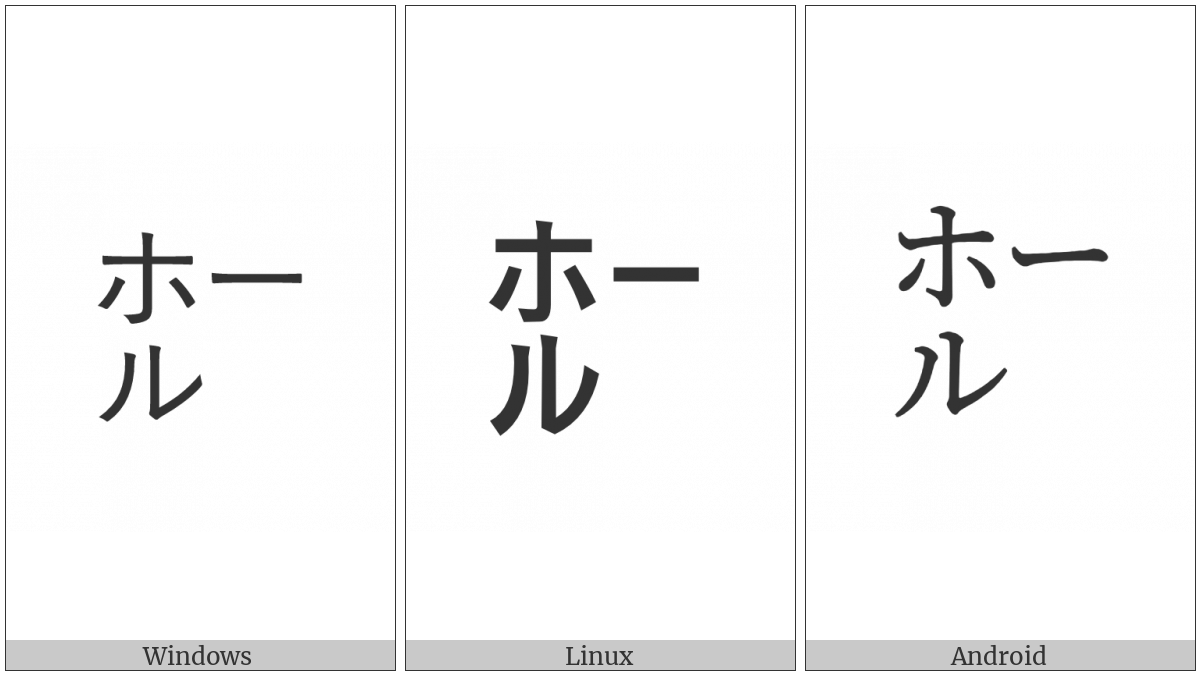 The image below shows how the “Square Hooru” symbol might look like on different operating systems. If the font in which this web site is displayed does not contain the symbol and there is no fallback font able to render it, you can use the image below to get an idea of what it should look like.