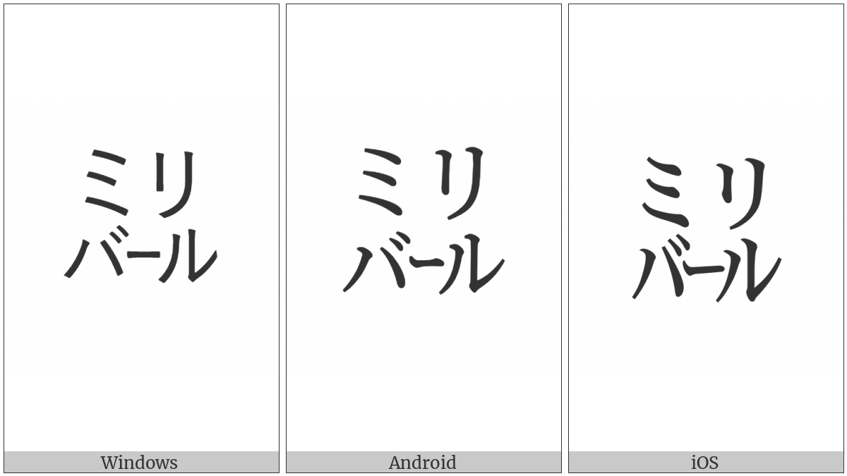 The image below shows how the “Square Miribaaru” symbol might look like on different operating systems. If the font in which this web site is displayed does not contain the symbol and there is no fallback font able to render it, you can use the image below to get an idea of what it should look like.