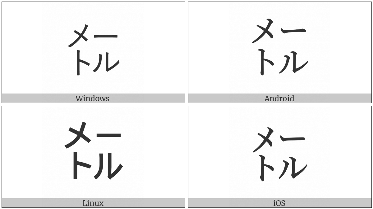 The image below shows how the “Square Meetoru” symbol might look like on different operating systems. If the font in which this web site is displayed does not contain the symbol and there is no fallback font able to render it, you can use the image below to get an idea of what it should look like.