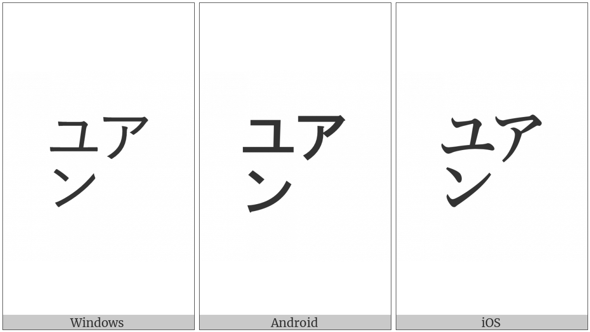 The image below shows how the “Square Yuan” symbol might look like on different operating systems. If the font in which this web site is displayed does not contain the symbol and there is no fallback font able to render it, you can use the image below to get an idea of what it should look like.