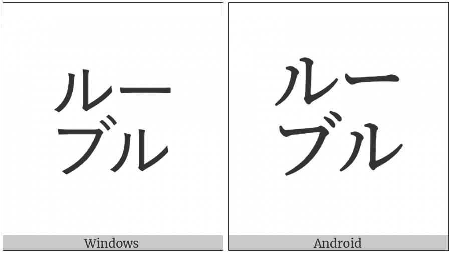 The image below shows how the “Square Ruuburu” symbol might look like on different operating systems. If the font in which this web site is displayed does not contain the symbol and there is no fallback font able to render it, you can use the image below to get an idea of what it should look like.