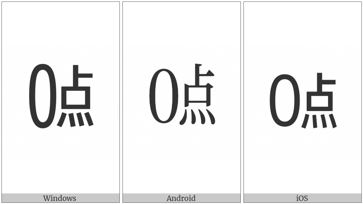 The image below shows how the “Ideographic Telegraph Symbol For Hour Zero” symbol might look like on different operating systems. If the font in which this web site is displayed does not contain the symbol and there is no fallback font able to render it, you can use the image below to get an idea of what it should look like.