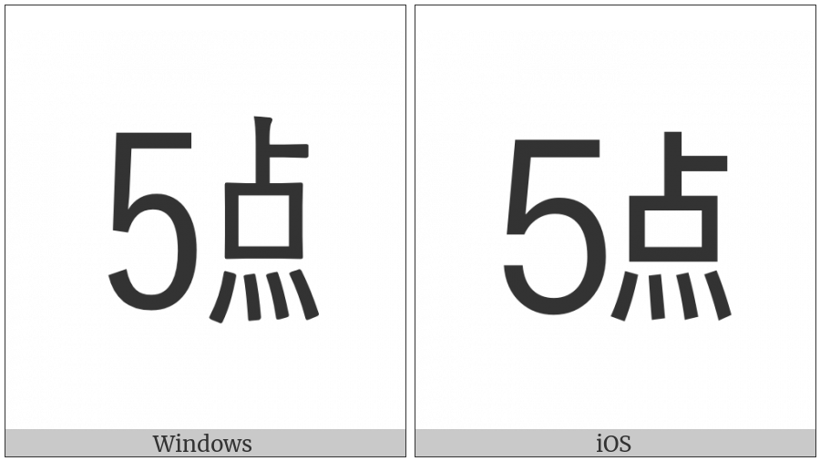 The image below shows how the “Ideographic Telegraph Symbol For Hour Five” symbol might look like on different operating systems. If the font in which this web site is displayed does not contain the symbol and there is no fallback font able to render it, you can use the image below to get an idea of what it should look like.