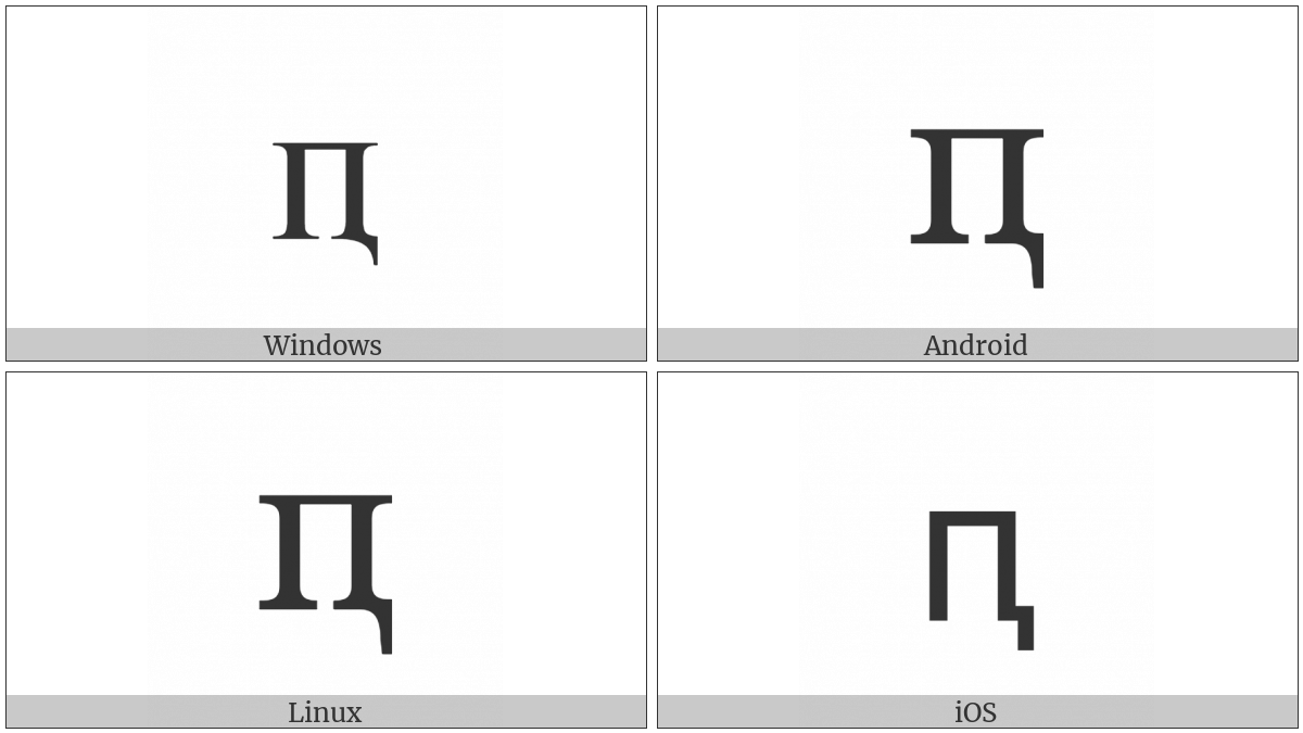 The image below shows how the “Cyrillic Small Letter Pe With Descender” symbol might look like on different operating systems. If the font in which this web site is displayed does not contain the symbol and there is no fallback font able to render it, you can use the image below to get an idea of what it should look like.