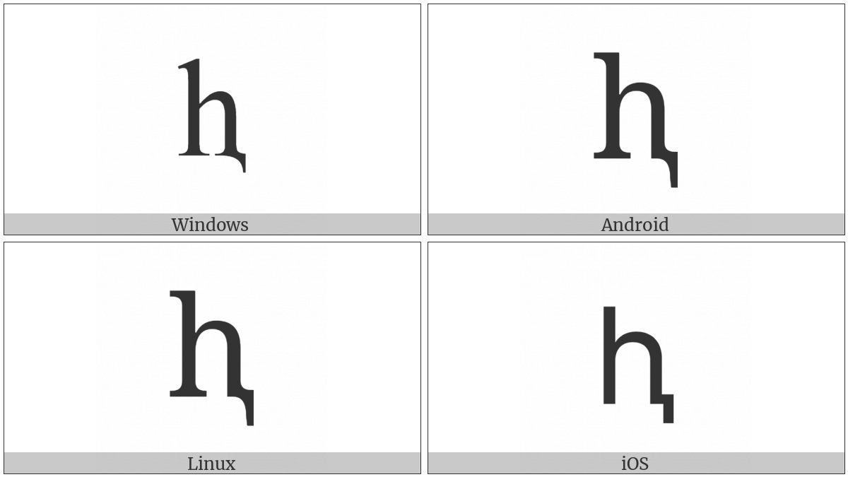 The image below shows how the “Cyrillic Small Letter Shha With Descender” symbol might look like on different operating systems. If the font in which this web site is displayed does not contain the symbol and there is no fallback font able to render it, you can use the image below to get an idea of what it should look like.