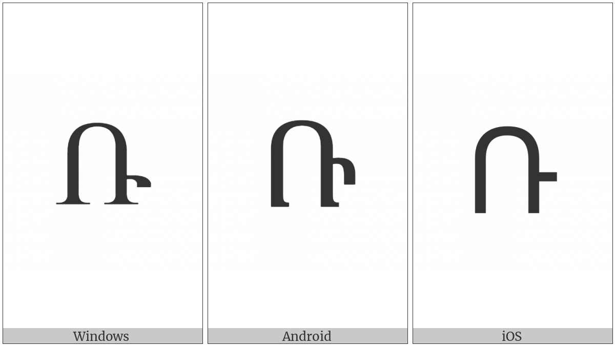 The image below shows how the “Armenian Capital Letter Ra” symbol might look like on different operating systems. If the font in which this web site is displayed does not contain the symbol and there is no fallback font able to render it, you can use the image below to get an idea of what it should look like.
