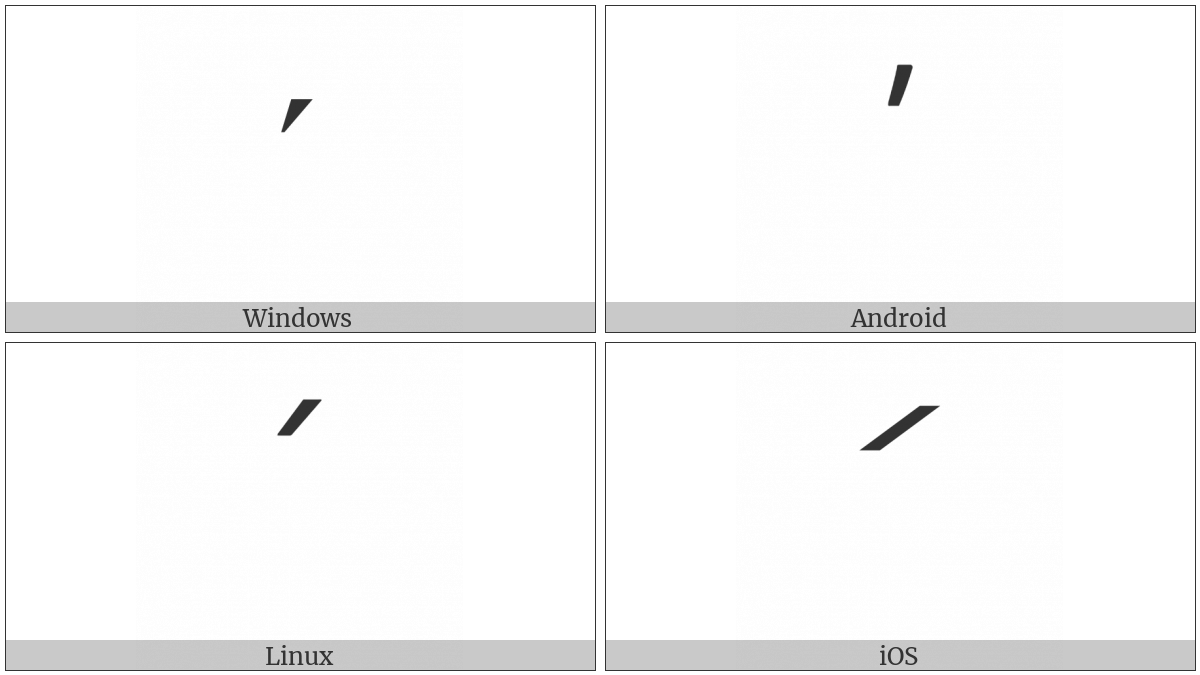 The image below shows how the “Armenian Emphasis Mark” symbol might look like on different operating systems. If the font in which this web site is displayed does not contain the symbol and there is no fallback font able to render it, you can use the image below to get an idea of what it should look like.