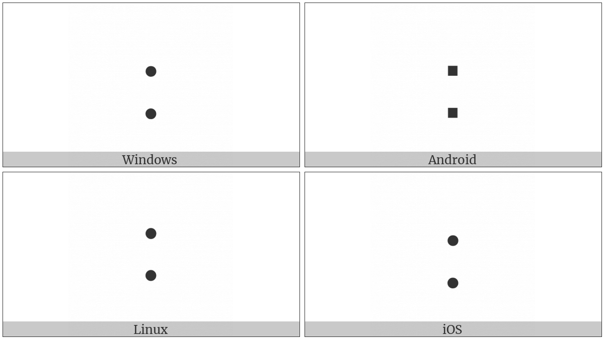 The image below shows how the “Hebrew Punctuation Sof Pasuq” symbol might look like on different operating systems. If the font in which this web site is displayed does not contain the symbol and there is no fallback font able to render it, you can use the image below to get an idea of what it should look like.