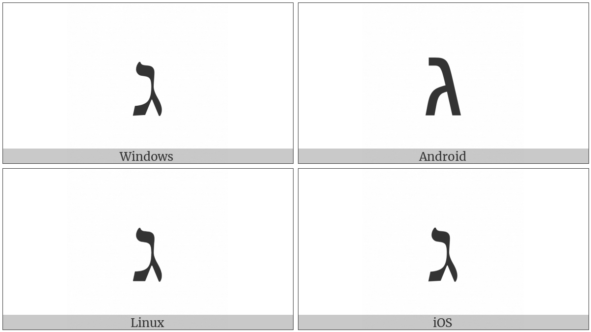 The image below shows how the “Hebrew Letter Gimel” symbol might look like on different operating systems. If the font in which this web site is displayed does not contain the symbol and there is no fallback font able to render it, you can use the image below to get an idea of what it should look like.