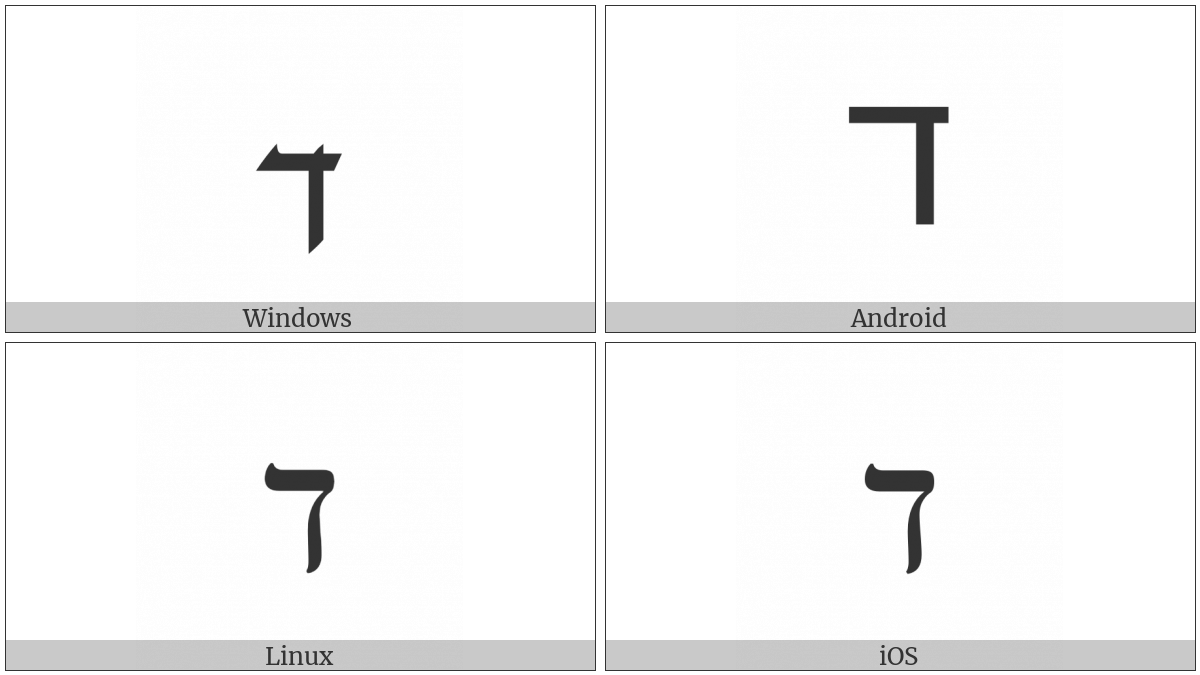The image below shows how the “Hebrew Letter Dalet” symbol might look like on different operating systems. If the font in which this web site is displayed does not contain the symbol and there is no fallback font able to render it, you can use the image below to get an idea of what it should look like.