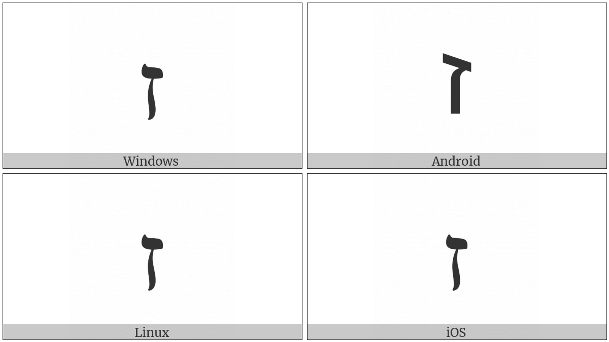 The image below shows how the “Hebrew Letter Zayin” symbol might look like on different operating systems. If the font in which this web site is displayed does not contain the symbol and there is no fallback font able to render it, you can use the image below to get an idea of what it should look like.