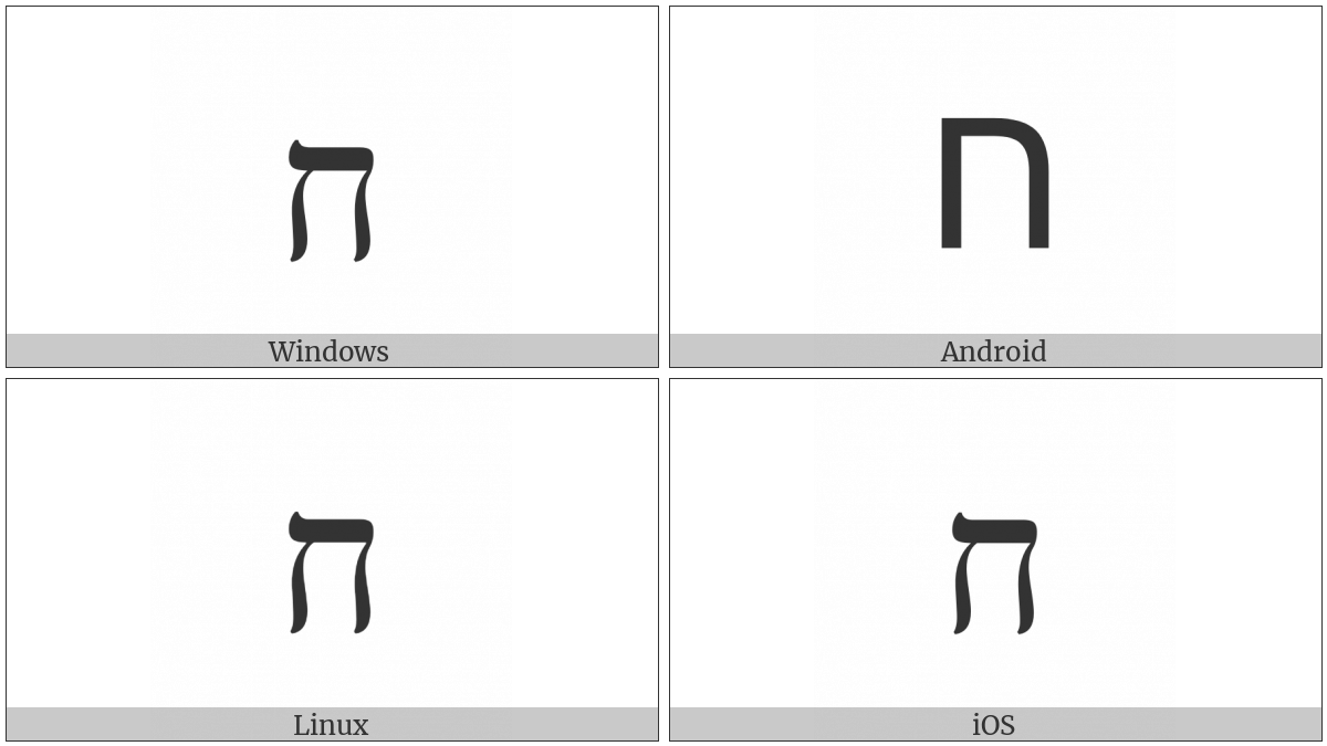 The image below shows how the “Hebrew Letter Het” symbol might look like on different operating systems. If the font in which this web site is displayed does not contain the symbol and there is no fallback font able to render it, you can use the image below to get an idea of what it should look like.