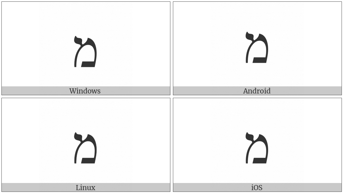 The image below shows how the “Hebrew Letter Mem” symbol might look like on different operating systems. If the font in which this web site is displayed does not contain the symbol and there is no fallback font able to render it, you can use the image below to get an idea of what it should look like.