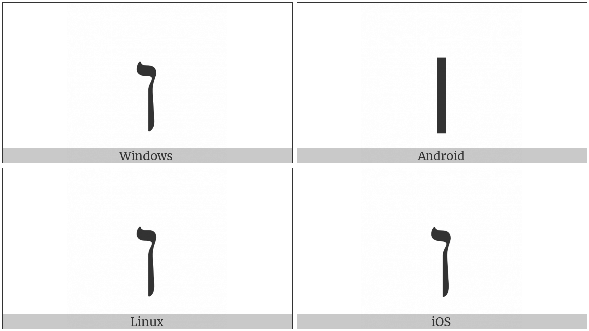 The image below shows how the “Hebrew Letter Final Nun” symbol might look like on different operating systems. If the font in which this web site is displayed does not contain the symbol and there is no fallback font able to render it, you can use the image below to get an idea of what it should look like.