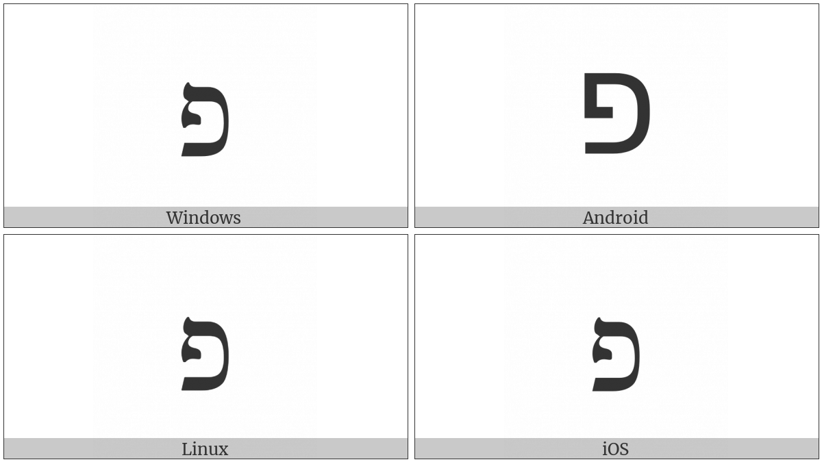 The image below shows how the “Hebrew Letter Pe” symbol might look like on different operating systems. If the font in which this web site is displayed does not contain the symbol and there is no fallback font able to render it, you can use the image below to get an idea of what it should look like.