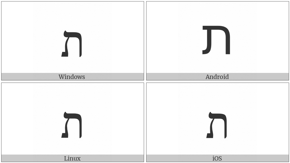 The image below shows how the “Hebrew Letter Tav” symbol might look like on different operating systems. If the font in which this web site is displayed does not contain the symbol and there is no fallback font able to render it, you can use the image below to get an idea of what it should look like.
