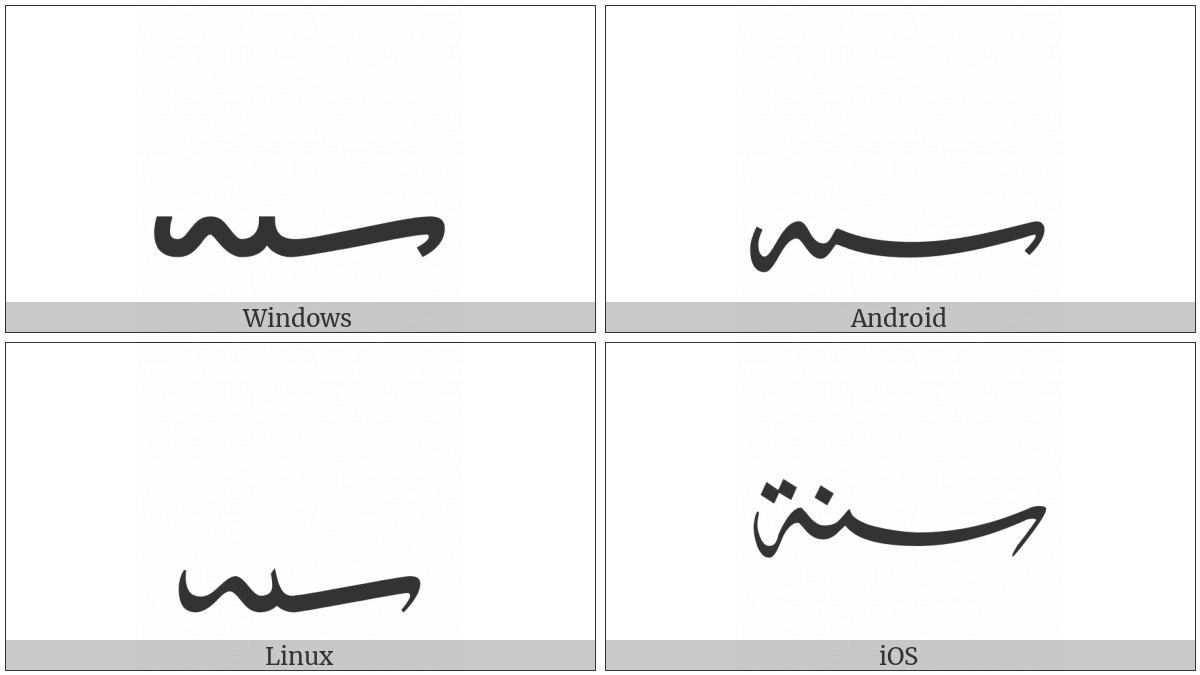 The image below shows how the “Arabic Sign Sanah” symbol might look like on different operating systems. If the font in which this web site is displayed does not contain the symbol and there is no fallback font able to render it, you can use the image below to get an idea of what it should look like.