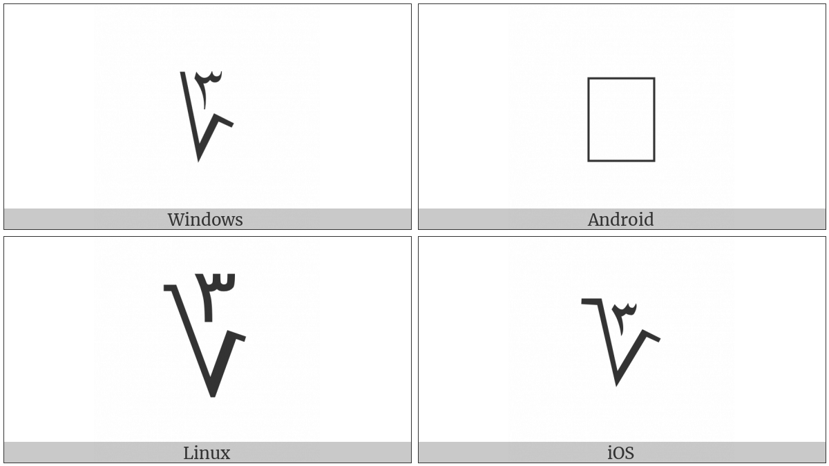 The image below shows how the “Arabic-Indic Cube Root” symbol might look like on different operating systems. If the font in which this web site is displayed does not contain the symbol and there is no fallback font able to render it, you can use the image below to get an idea of what it should look like.
