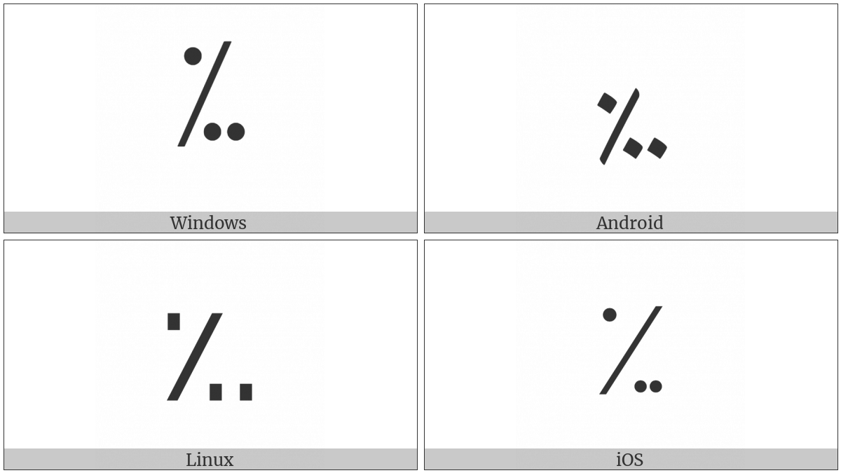 The image below shows how the “Arabic-Indic Per Mille Sign” symbol might look like on different operating systems. If the font in which this web site is displayed does not contain the symbol and there is no fallback font able to render it, you can use the image below to get an idea of what it should look like.