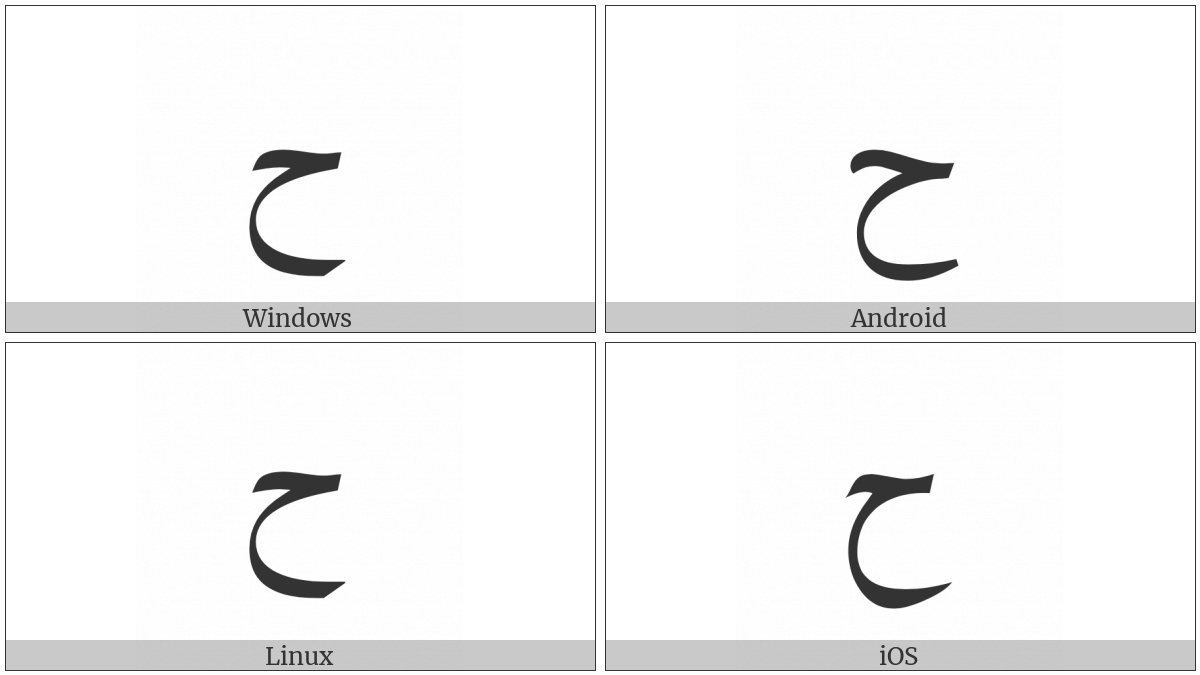 The image below shows how the “Arabic Letter Hah” symbol might look like on different operating systems. If the font in which this web site is displayed does not contain the symbol and there is no fallback font able to render it, you can use the image below to get an idea of what it should look like.