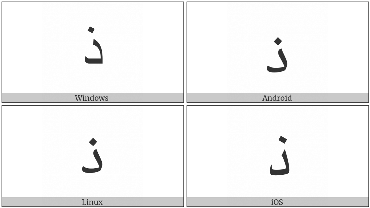 The image below shows how the “Arabic Letter Thal” symbol might look like on different operating systems. If the font in which this web site is displayed does not contain the symbol and there is no fallback font able to render it, you can use the image below to get an idea of what it should look like.