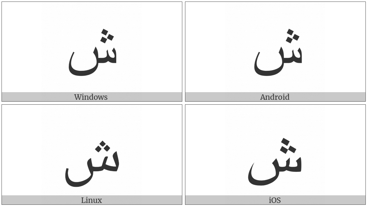 The image below shows how the “Arabic Letter Sheen” symbol might look like on different operating systems. If the font in which this web site is displayed does not contain the symbol and there is no fallback font able to render it, you can use the image below to get an idea of what it should look like.