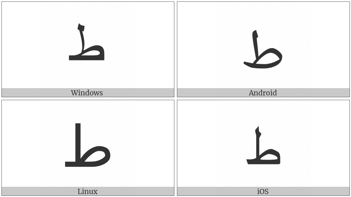 The image below shows how the “Arabic Letter Tah” symbol might look like on different operating systems. If the font in which this web site is displayed does not contain the symbol and there is no fallback font able to render it, you can use the image below to get an idea of what it should look like.
