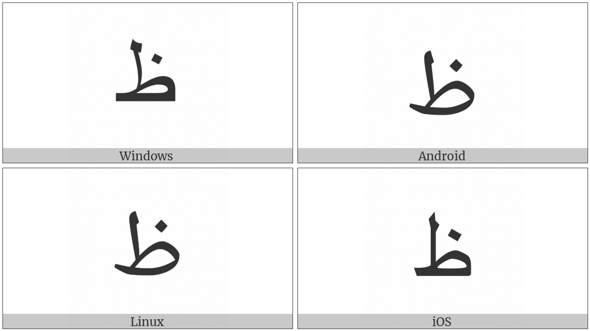 The image below shows how the “Arabic Letter Zah” symbol might look like on different operating systems. If the font in which this web site is displayed does not contain the symbol and there is no fallback font able to render it, you can use the image below to get an idea of what it should look like.