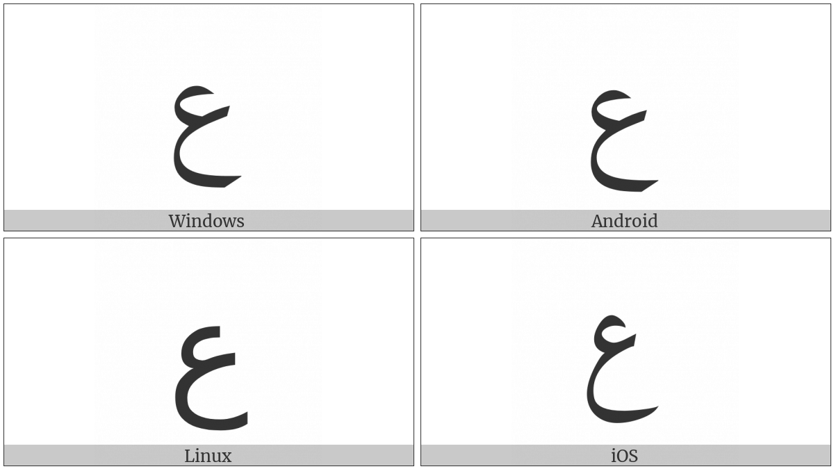 The image below shows how the “Arabic Letter Ain” symbol might look like on different operating systems. If the font in which this web site is displayed does not contain the symbol and there is no fallback font able to render it, you can use the image below to get an idea of what it should look like.
