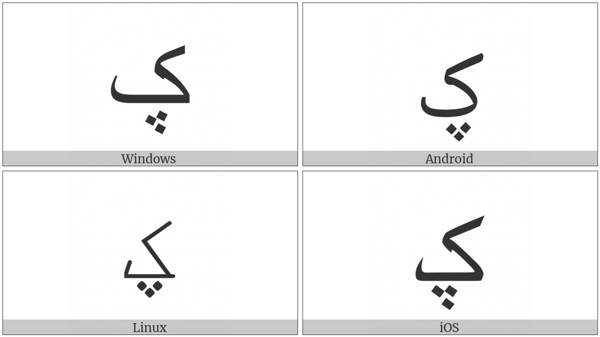 The image below shows how the “Arabic Letter Keheh With Three Dots Below” symbol might look like on different operating systems. If the font in which this web site is displayed does not contain the symbol and there is no fallback font able to render it, you can use the image below to get an idea of what it should look like.