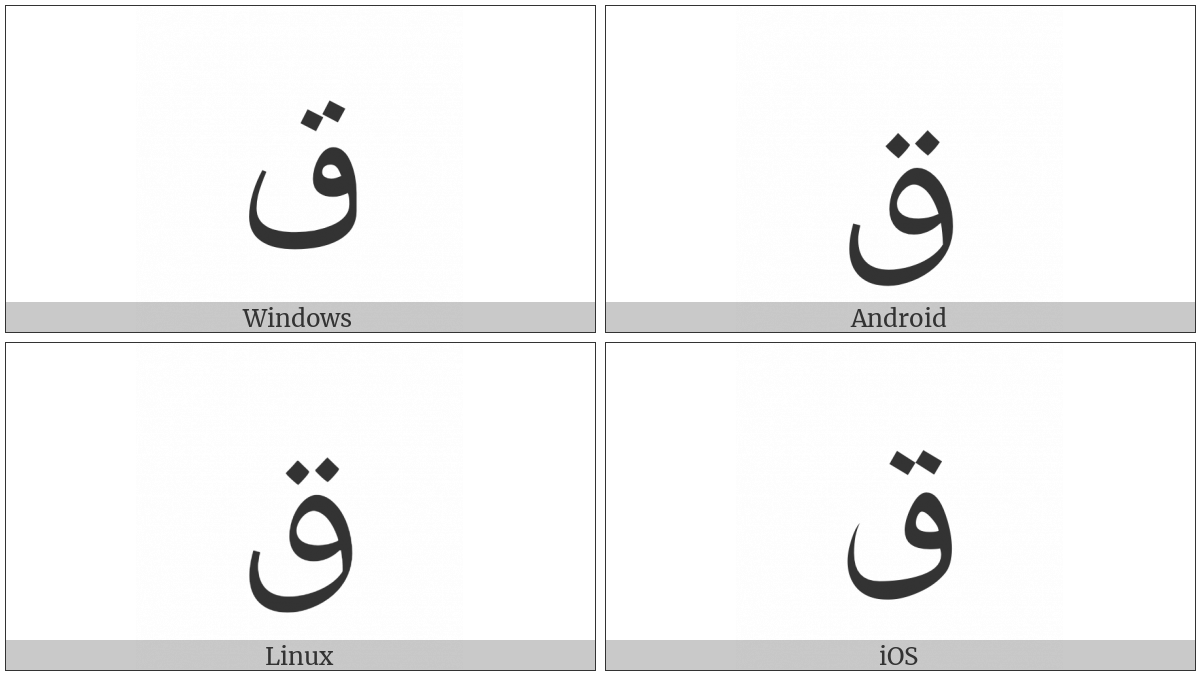 The image below shows how the “Arabic Letter Qaf” symbol might look like on different operating systems. If the font in which this web site is displayed does not contain the symbol and there is no fallback font able to render it, you can use the image below to get an idea of what it should look like.