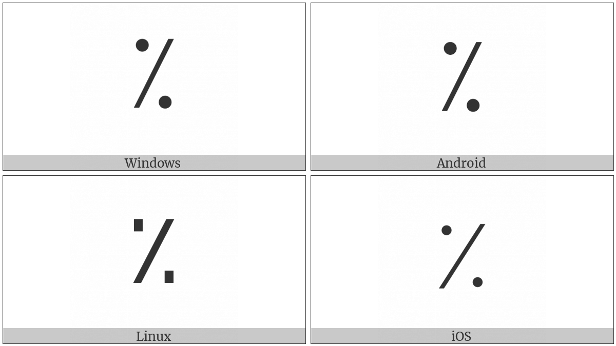 The image below shows how the “Arabic Percent Sign” symbol might look like on different operating systems. If the font in which this web site is displayed does not contain the symbol and there is no fallback font able to render it, you can use the image below to get an idea of what it should look like.