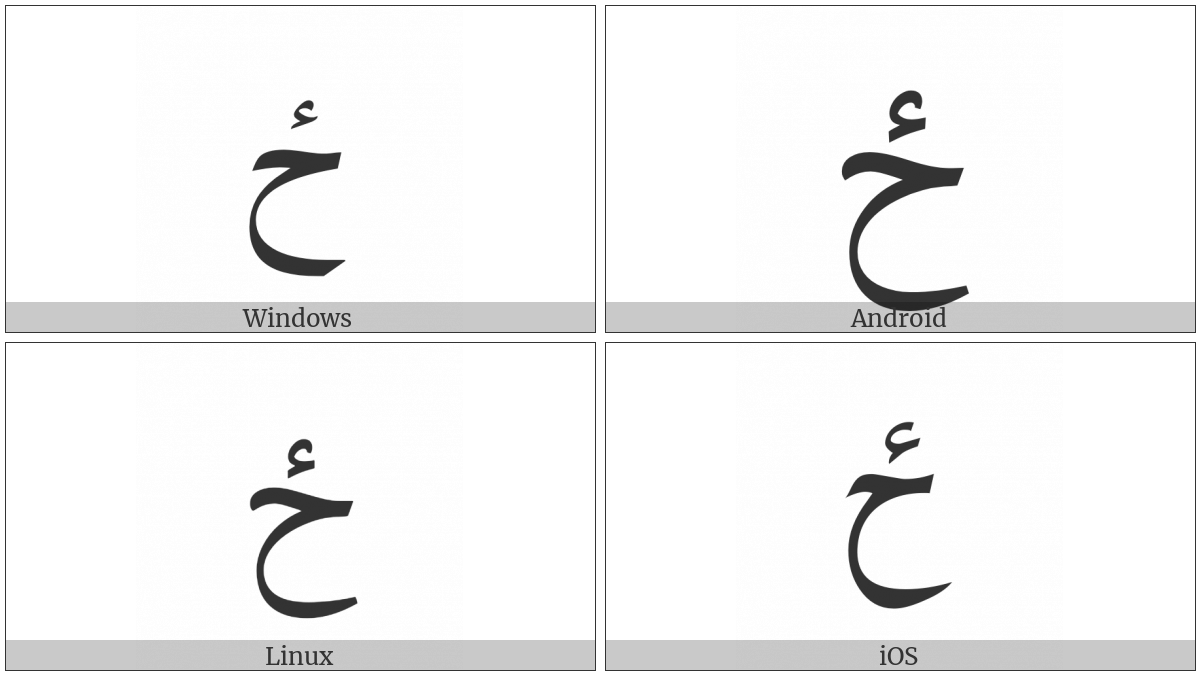 The image below shows how the “Arabic Letter Hah With Hamza Above” symbol might look like on different operating systems. If the font in which this web site is displayed does not contain the symbol and there is no fallback font able to render it, you can use the image below to get an idea of what it should look like.