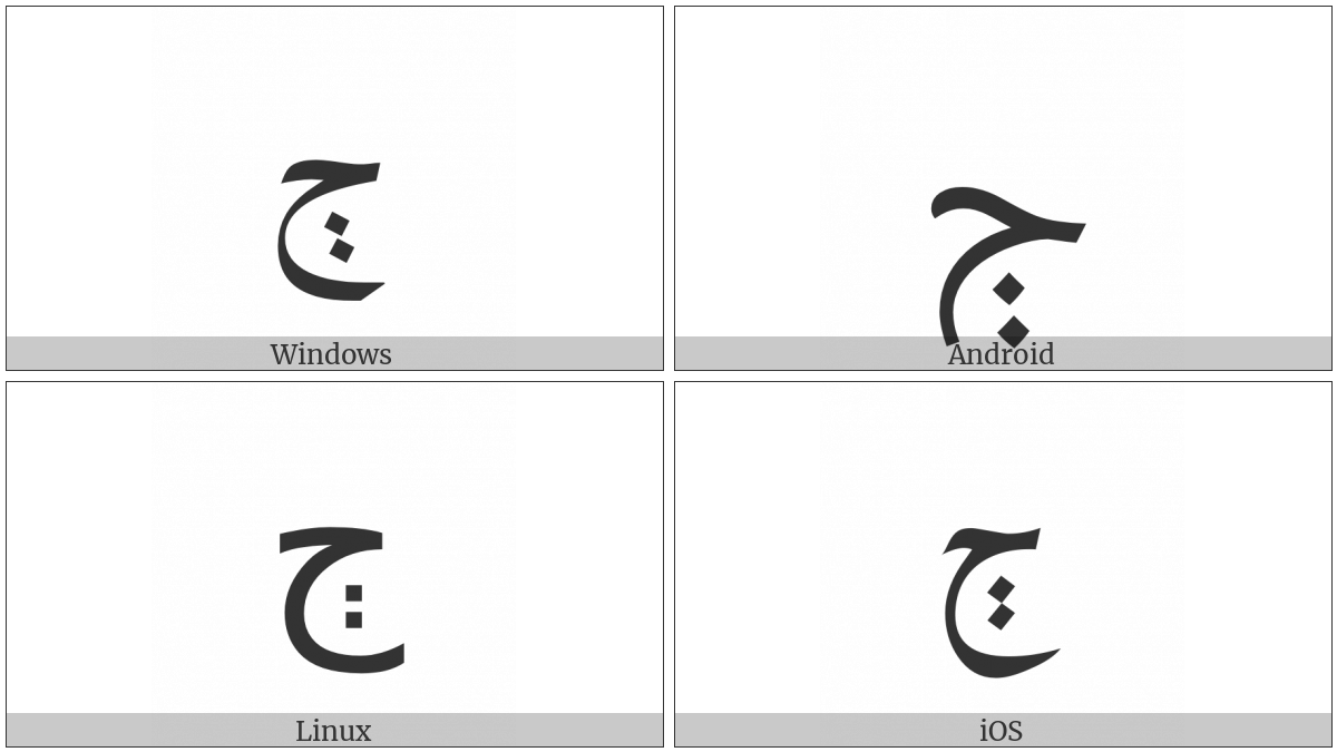 The image below shows how the “Arabic Letter Dyeh” symbol might look like on different operating systems. If the font in which this web site is displayed does not contain the symbol and there is no fallback font able to render it, you can use the image below to get an idea of what it should look like.